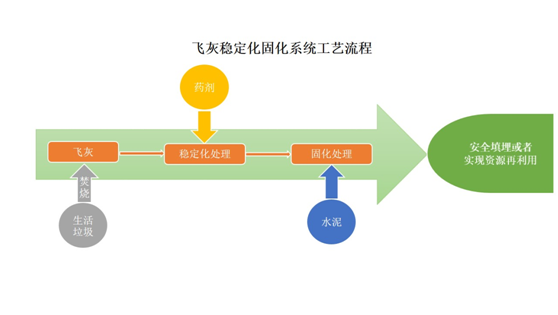 工藝技術:采用以藥劑穩(wěn)定化為主、水泥基固化法為輔的工藝處理技術。通過藥劑的加入將飛灰內(nèi)的重金屬等有毒有害分子通過化學反應進行穩(wěn)定化處理,再利用惰性基材水泥與水反應后可形成堅固塊體的特征,將有害廢物包容在緊密固化體中,使其中所有污染組分呈現(xiàn)化學惰性或被包容起來,減少重金屬對周圍環(huán)境的污染。經(jīng)過成型處理的飛灰混合物料具有低毒性、低溶解性、低遷移性,能在較為安全的條件下運輸與處置。